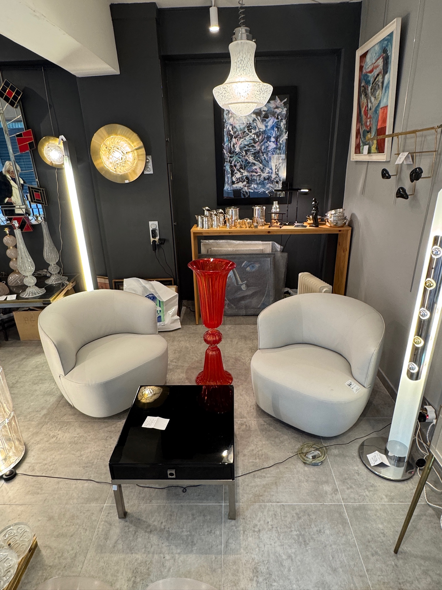 JUSTINE est spécialisée dans les objets du XXème et XXIème siècles et verre de Murano, lustres, lampes, appliques, miroirs, vases, meubles….
