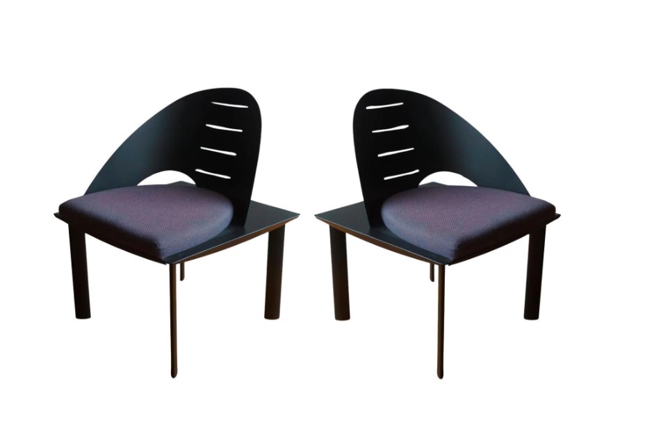 Paire de chaises – Patrice Bonneau – Edition Genexco – Circa 1980 en métal laqué noir, avec garniture gris violacé, au design typiquement postmoderne, avec un dossier asymétrique. En très bon état vintage. Dimensions : H76 x L58 x D58 1 400 €